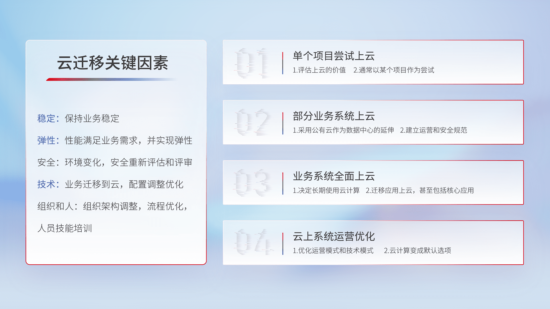 结合实际业务,,,从规划设计、、云平台选型、、、、云原生改造、、数据迁移、、集成交付,,,,迁移全过程为客户识别最佳上云路径,,做好风险识别管理,,,设计网络架构、、身份权限、、、安全审计合规、、、、操作审计、、日志审计、、监控告警策略、、多站点容灾设计等,,,,对云上基础设施进行整体规划,,提升IT治理水平,,,,以满足弹性、、、高可用、、高性能的需求。。。