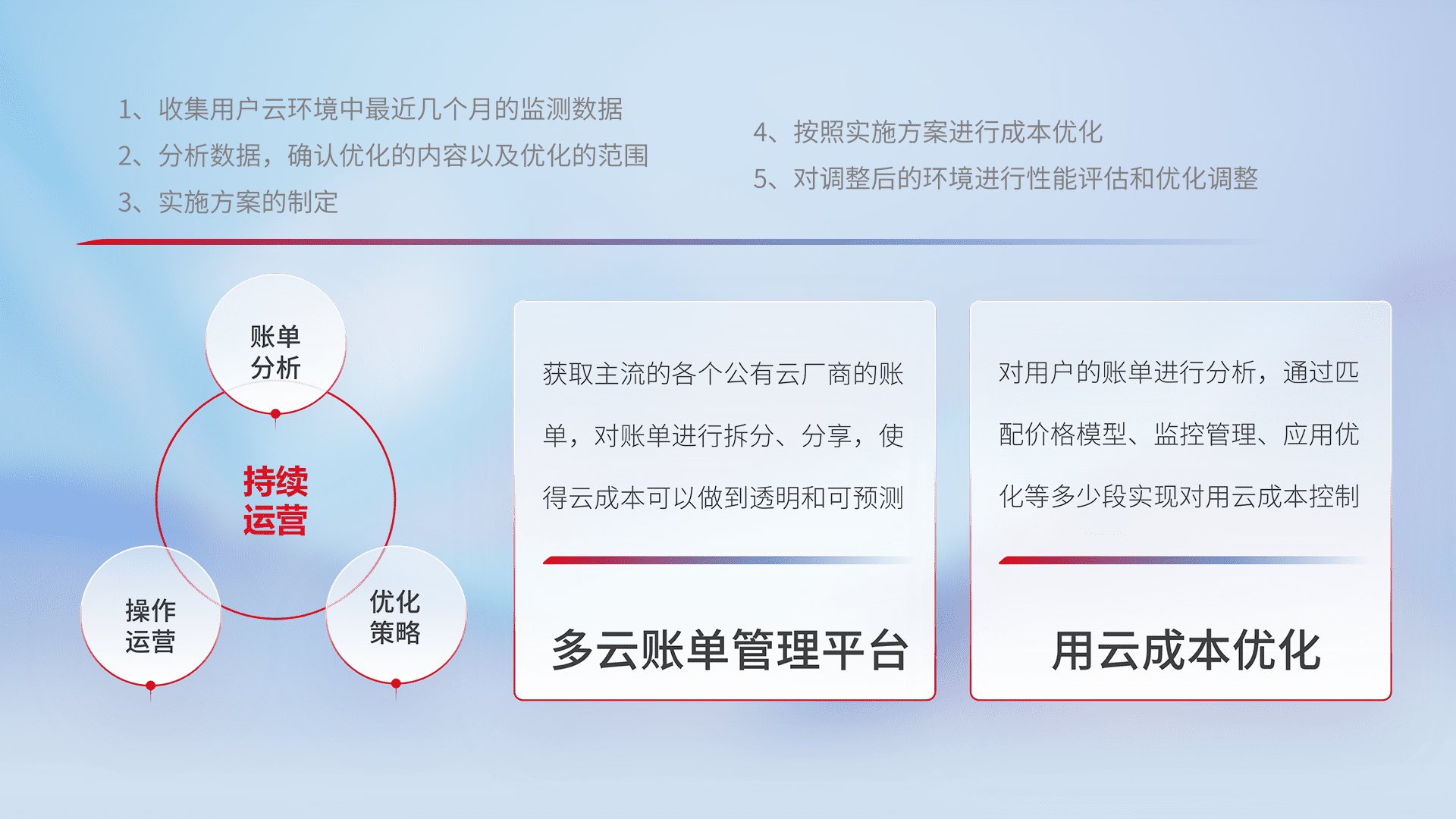 通过多云纳管,,,,以统一的资源数据模型把客户的云资源进行抽象和封装,,,进而实现对多云资源的统一操作,,,,保障云资源管理的可靠性、、、、稳定性与可用性。。。。量身定制化运维内容,,,,配置、、、、开发运维、、、补丁管理、、、、备份、、、、监控、、、、认证和访问管理、、、、审计和日常巡检等,,,保障在用云过程中的可靠度,,稳定度以及高可用率。。。。
